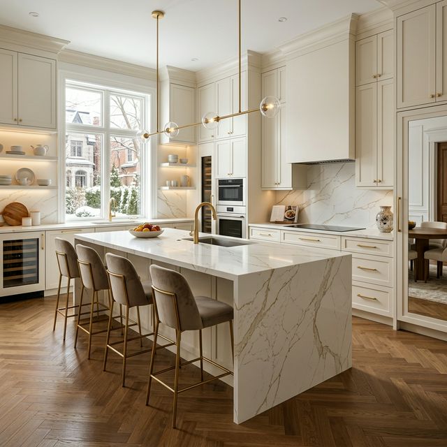 Custom cabinets in wood veneer or matte lacquer, quartz or granite countertops, waterfall island, integrated appliances. Every project is designed for a lasting impact and to increase property value. Ideal for Westmount, Outremont, TMR, and Boucherville residences.